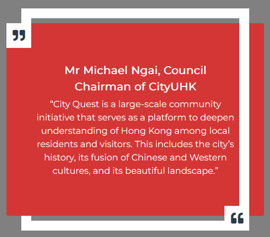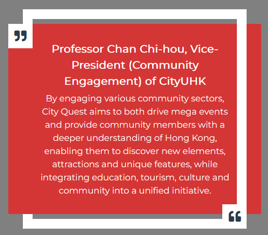 CityUHK is launching a community engagement programme, “City Quest”, to connect different sectors of the community, enabling people to gain a deeper understanding of Hong Kong and discover new attractions across the city. This initiative integrates four key elements including education, tourism, culture, sports and community.